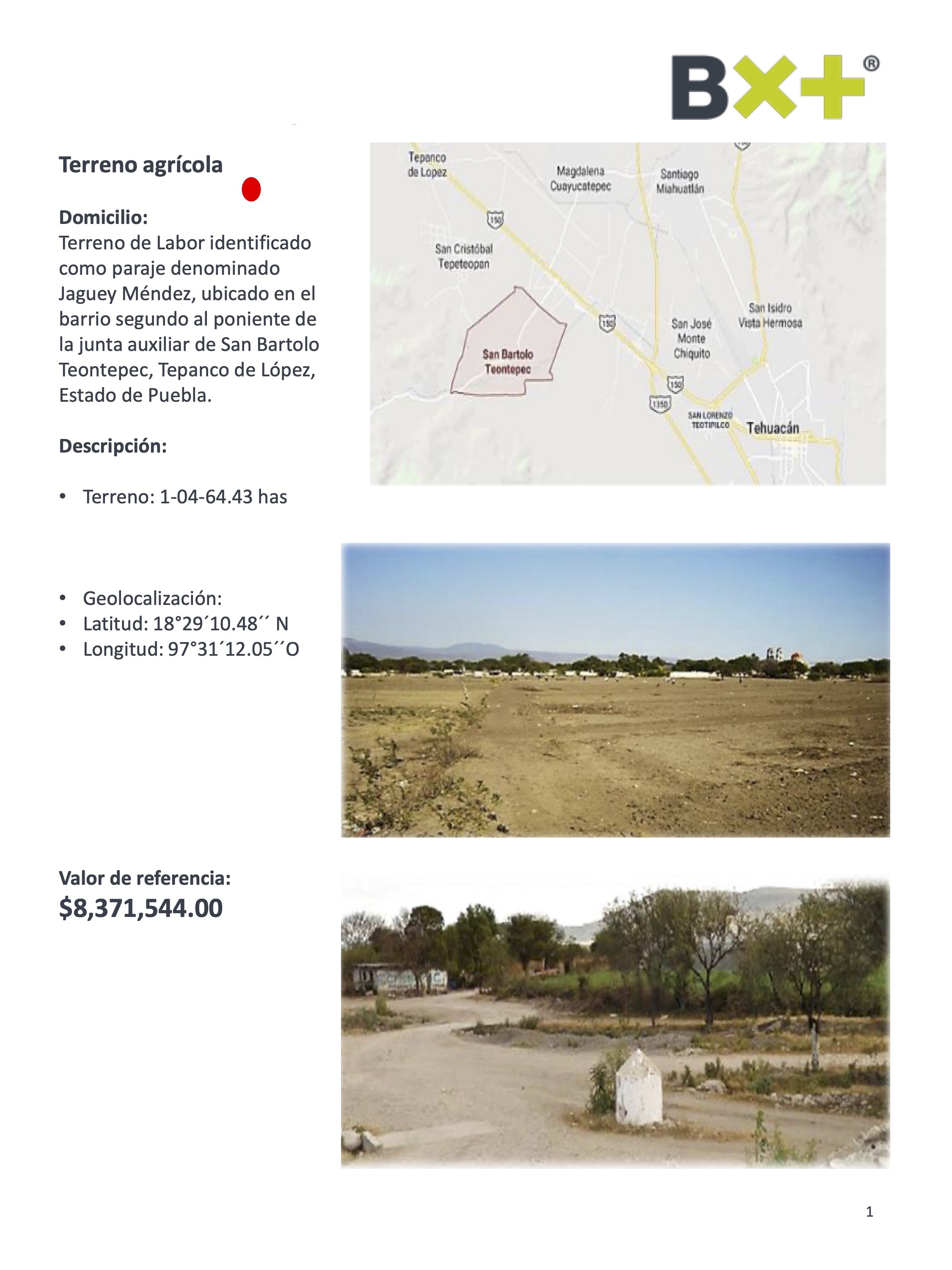 TERRENO AGRÍCOLA, TERRENO: 1-04-64.43 HAS, TERRENO DE LABOR IDENTIFICADO COMO PARAJE DENOMINADO JAGUEY MÉNDEZ, UBICADO EN EL BARRIO SEGUNDO AL PONIENTE DE LA JUNTA AUXILIAR DE SAN BARTOLO TEONTEPEC, TEPANCO DE LÓPEZ, ESTADO DE PUEBLA.