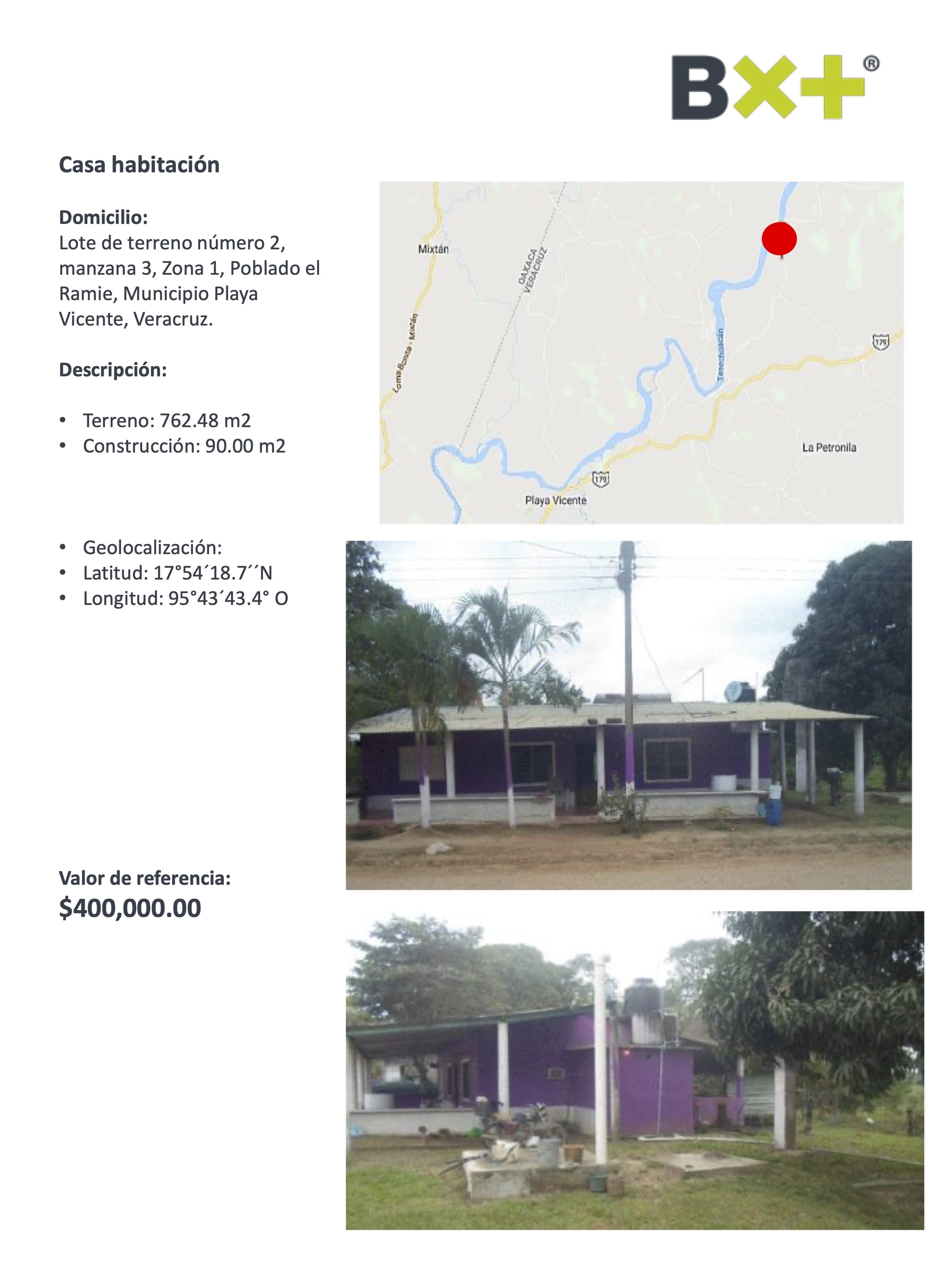 CASA HABITACIÓN, TERRENO: 762.48 M2, CONSTRUCCIÓN: 90.00 M2, LOTE DE TERRENO NÚMERO 2, MANZANA 3, ZONA 1, POBLADO EL RAMIE, MUNICIPIO PLAYA VICENTE, VERACRUZ.