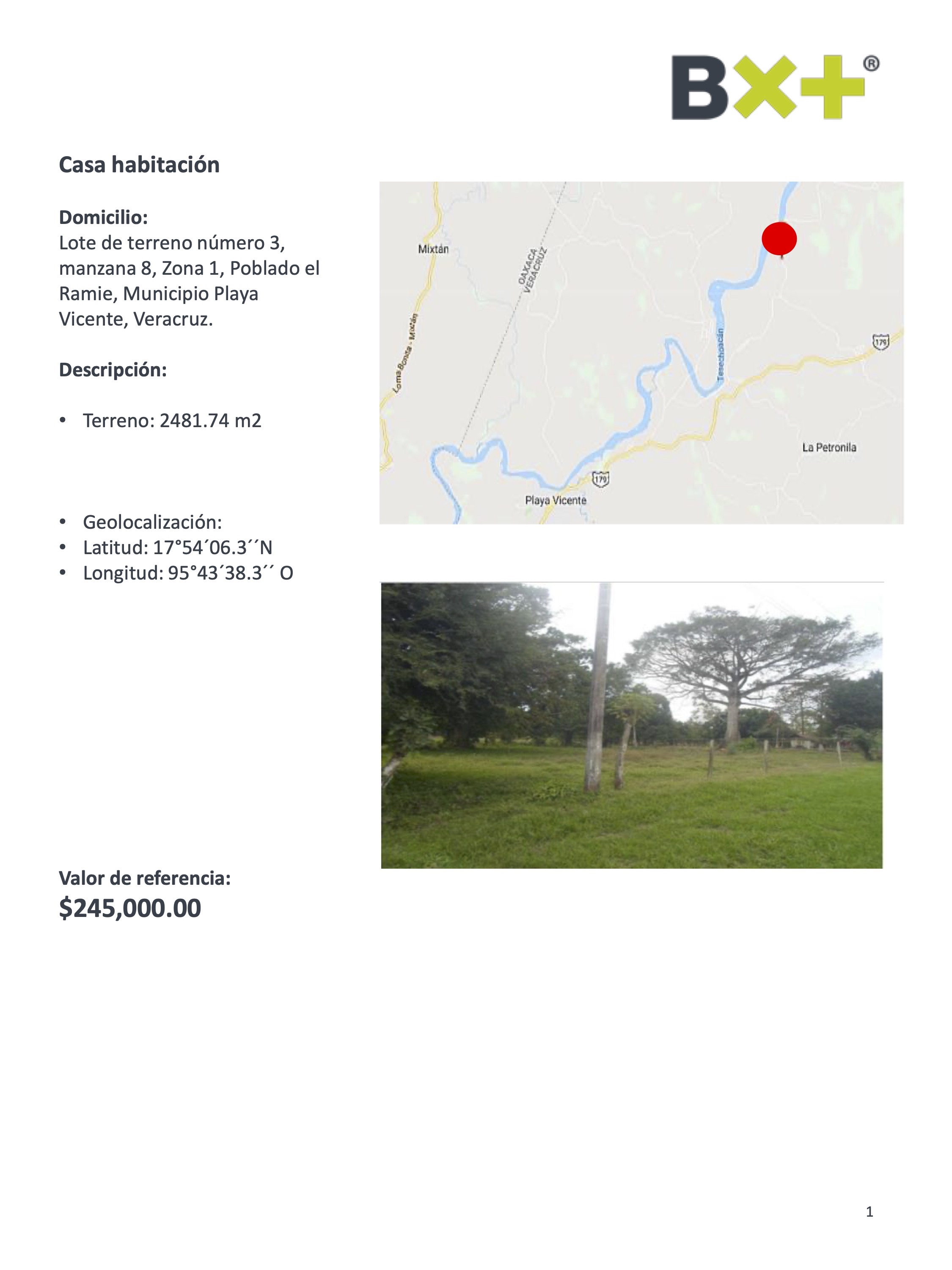 CASA HABITACIÓN, TERRENO: 2481.74 M2, LOTE DE TERRENO NÚMERO 3, MANZANA 8, ZONA 1, POBLADO EL RAMIE, MUNICIPIO PLAYA VICENTE, VERACRUZ.