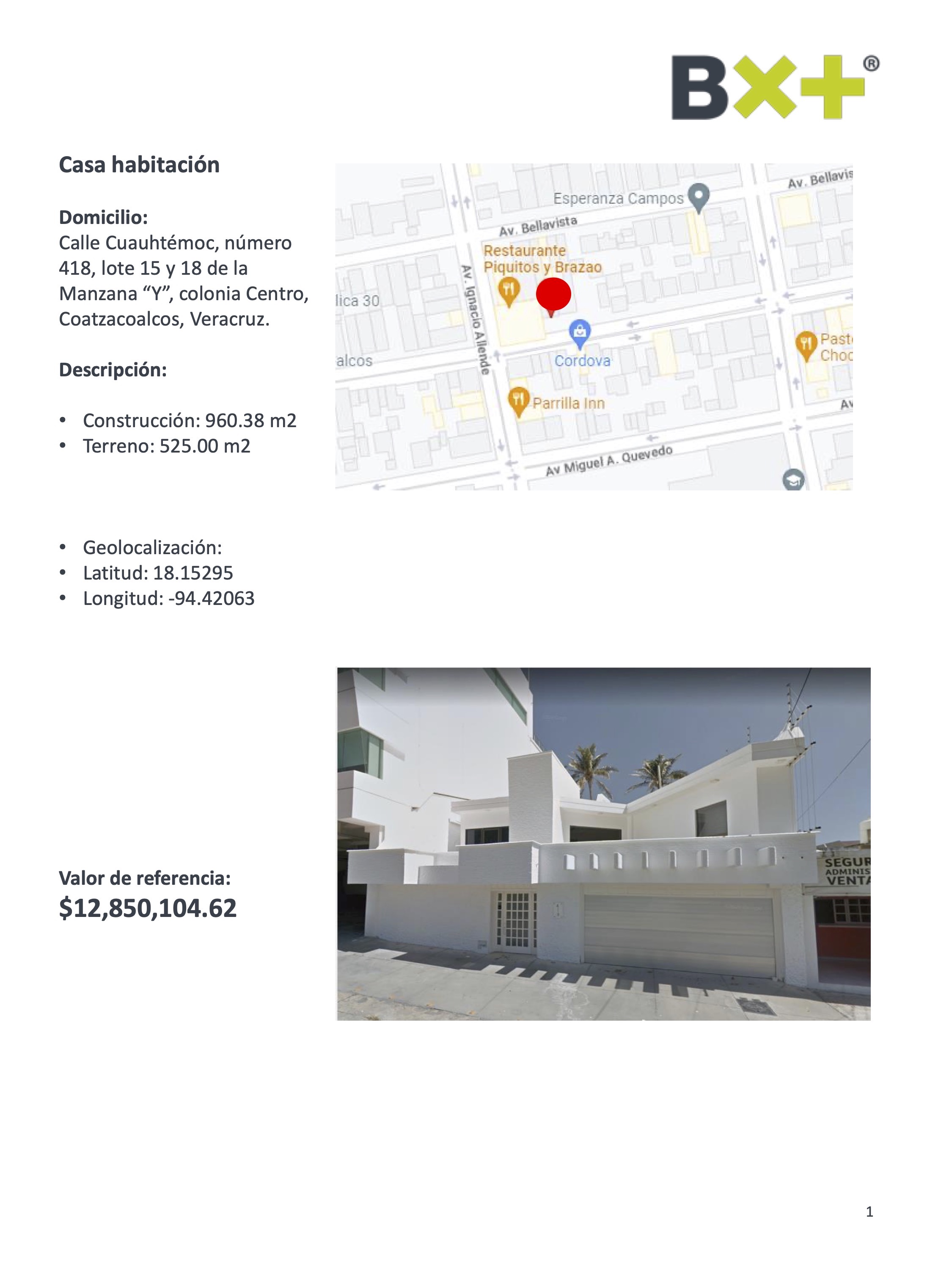 CASA HABITACIÓN, CONSTRUCCIÓN: 960.38 M2, TERRENO: 525.00 M2, CALLE CUAUHTÉMOC, NÚMERO 418, LOTE 15 Y 18 DE LA MANZANA "Y", COLONIA CENTRO, COATZACOALCOS, VERACRUZ.