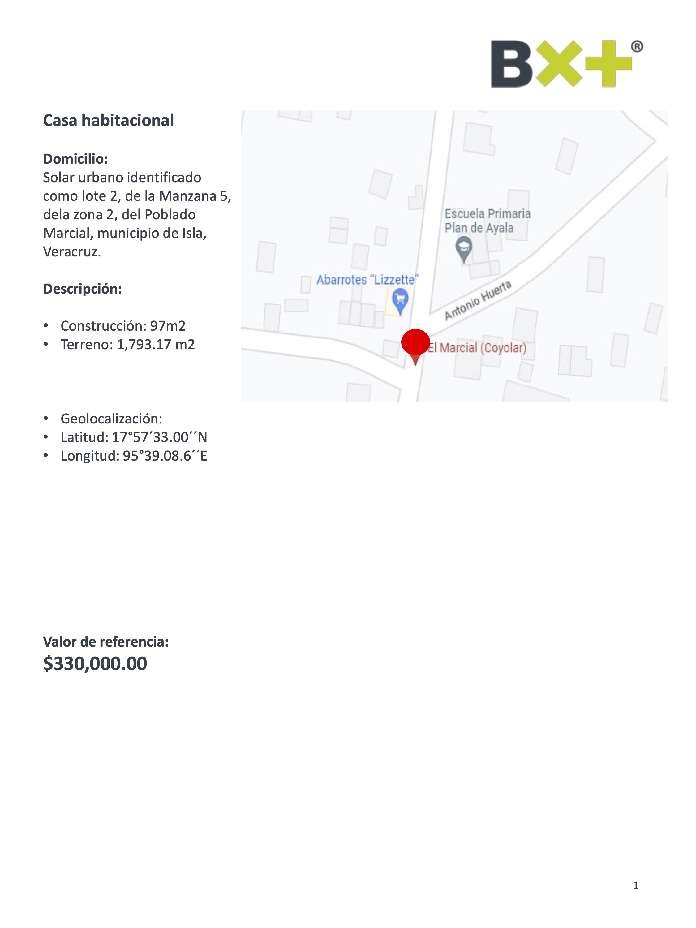 CASA HABITACIONAL, CONSTRUCCIÓN: 97M2, TERRENO: 1,793.17 M2, SOLAR URBANO IDENTIFICADO COMO LOTE 2, DE LA MANZANA 5, DELA ZONA 2, DEL POBLADO MARCIAL, MUNICIPIO DE ISLA, VERACRUZ.