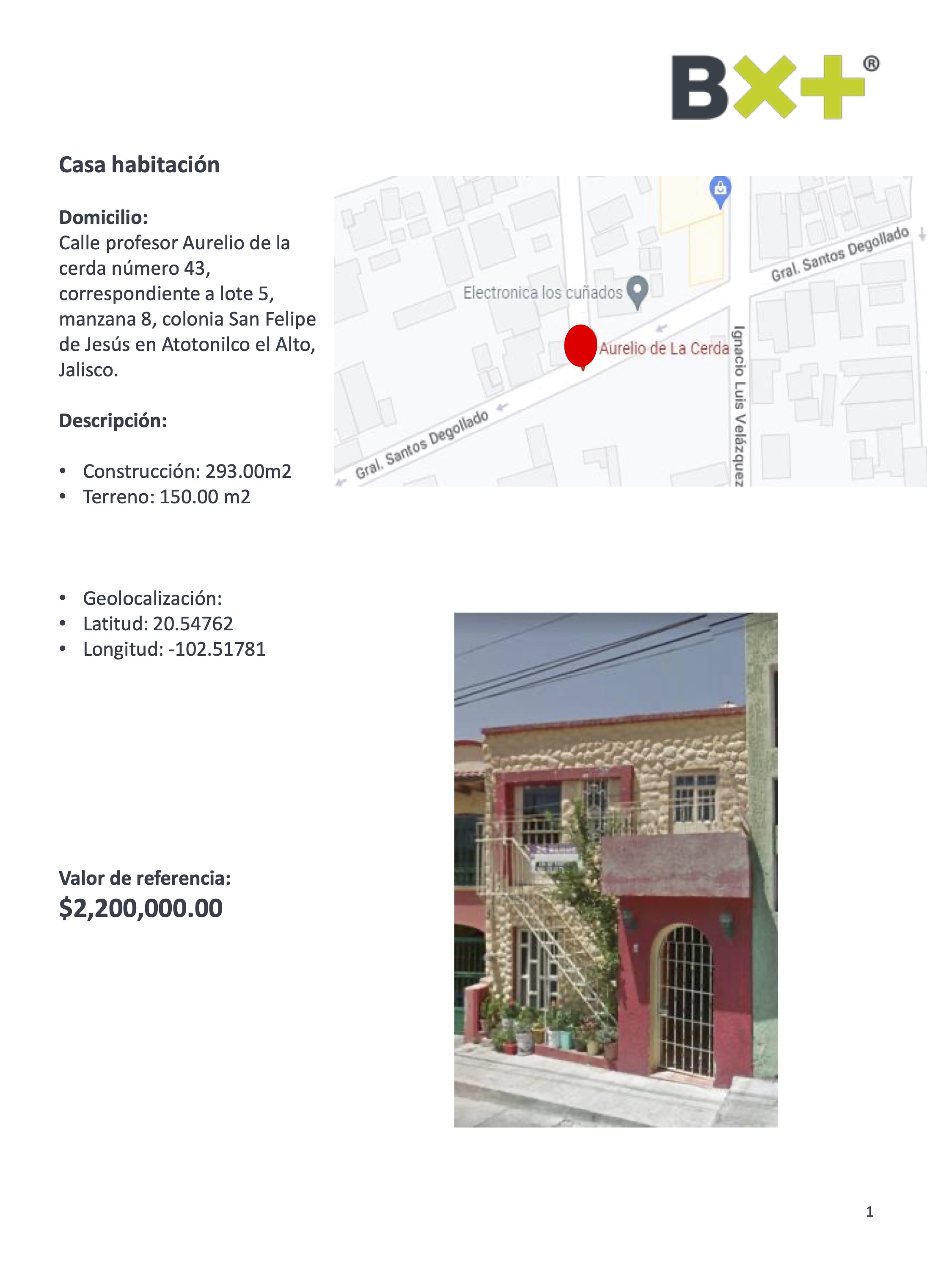CASA HABITACIÓN, CONSTRUCCIÓN: 293.00M2, TERRENO: 150.00 M2, CALLE PROFESOR AURELIO DE LA CERDA NÚMERO 43, CORRESPONDIENTE A LOTE 5, MANZANA 8, COLONIA SAN FELIPE DE JESÚS EN ATOTONILCO EL ALTO, JALISCO.