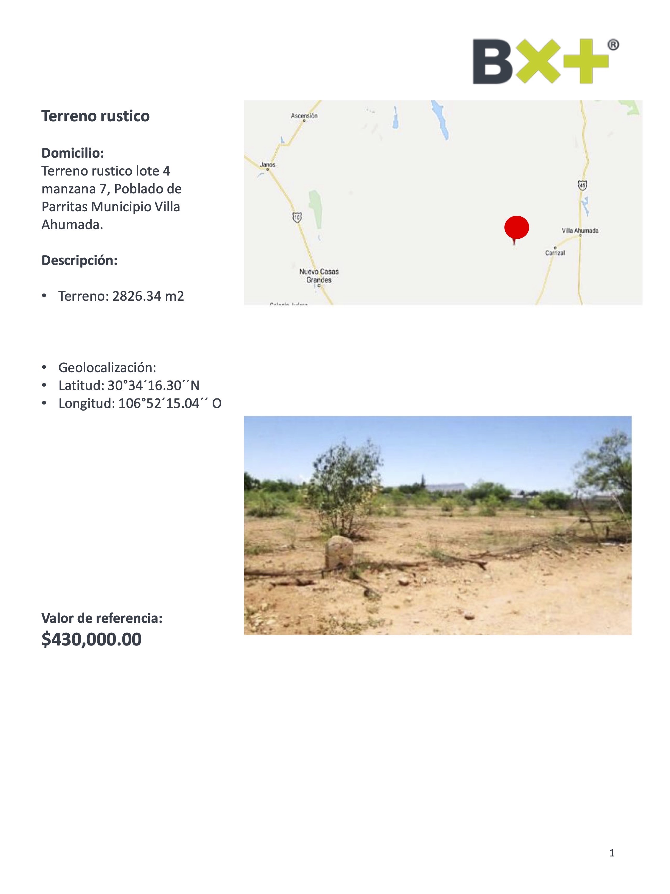 TERRENO RUSTICO, TERRENO: 2826.34 M2, TERRENO RUSTICO LOTE 4 MANZANA 7, POBLADO DE PARRITAS MUNICIPIO VILLA AHUMADA.