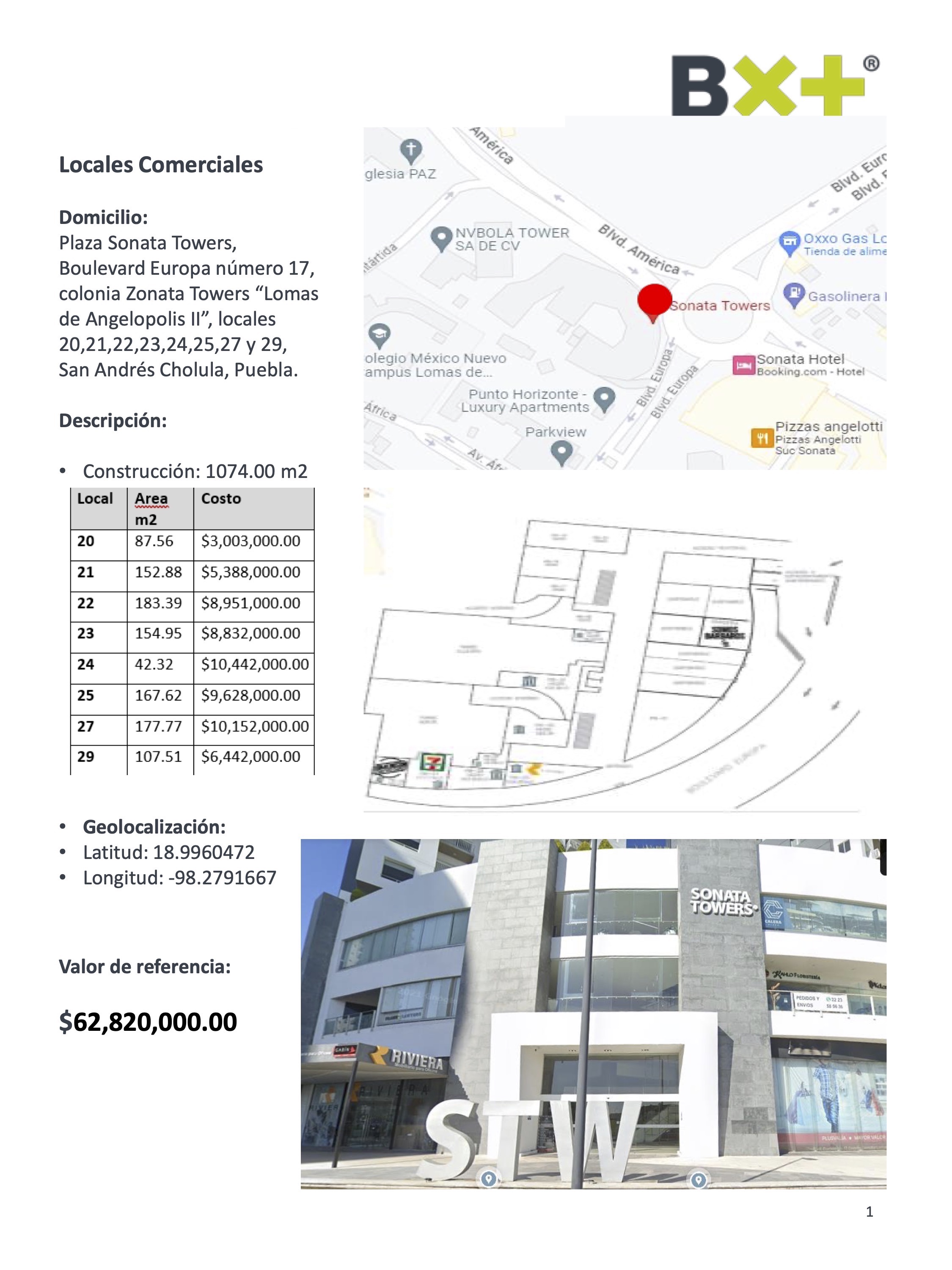 LOCALES COMERCIALES, CONSTRUCCIÓN: 1074.00 M2, PLAZA SONATA TOWERS, BOULEVARD EUROPA NÚMERO 17, COLONIA ZONATA TOWERS “LOMAS DE ANGELOPOLIS II”, LOCALES 20,21,22,23,24,25,27 Y 29, SAN ANDRÉS CHOLULA, PUEBLA.