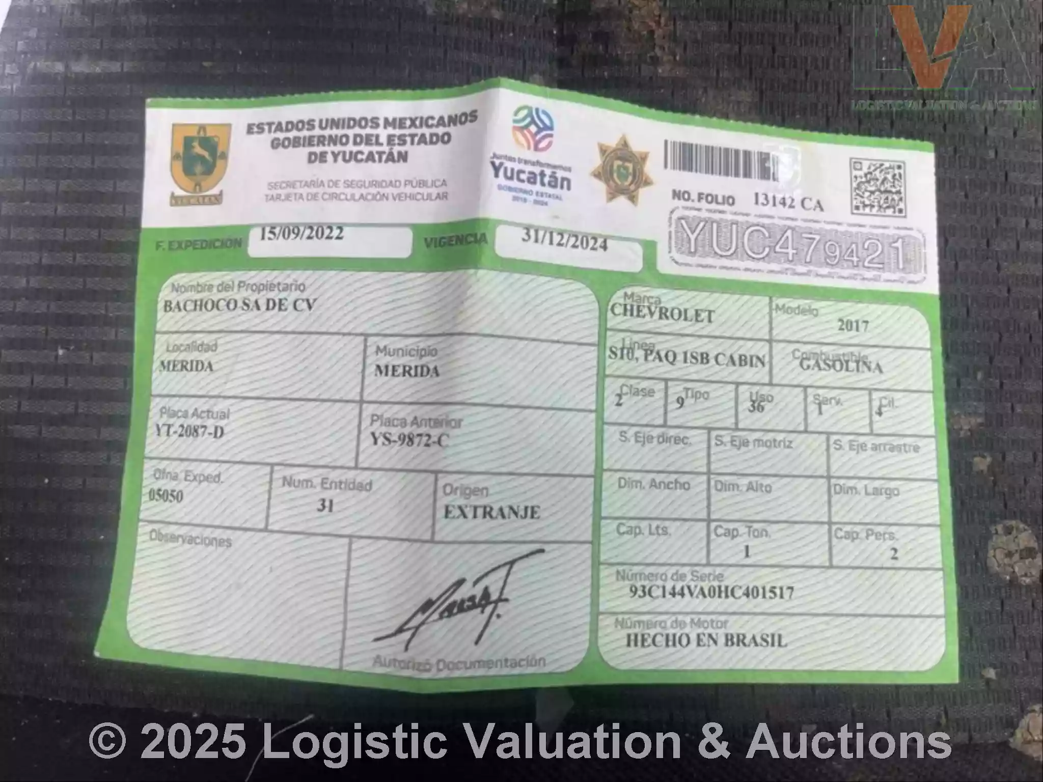 CAMIONETA, MARCA: CHEVROLET, MODELO: S10 CABINA REGULAR, AÑO: 2017, SERIE: 93C144VA0HC401517, CONDICIONES: CARROCERIA EN REGULAR ESTADO, INTERIORES EN REGULAR ESTADO, DAÑO EN BALERO COPILOTO, DAÑO EN 3 BOBINAS DE MOTOR, NO FUNCIONA EL VENTILADOR DEL A/A CUENTA CON DAÑO EN FASIA TRASERA, DAÑO EN ASIENTOS PILOTO Y COPILOTO, NO OPERABLE, ECO: T11426
