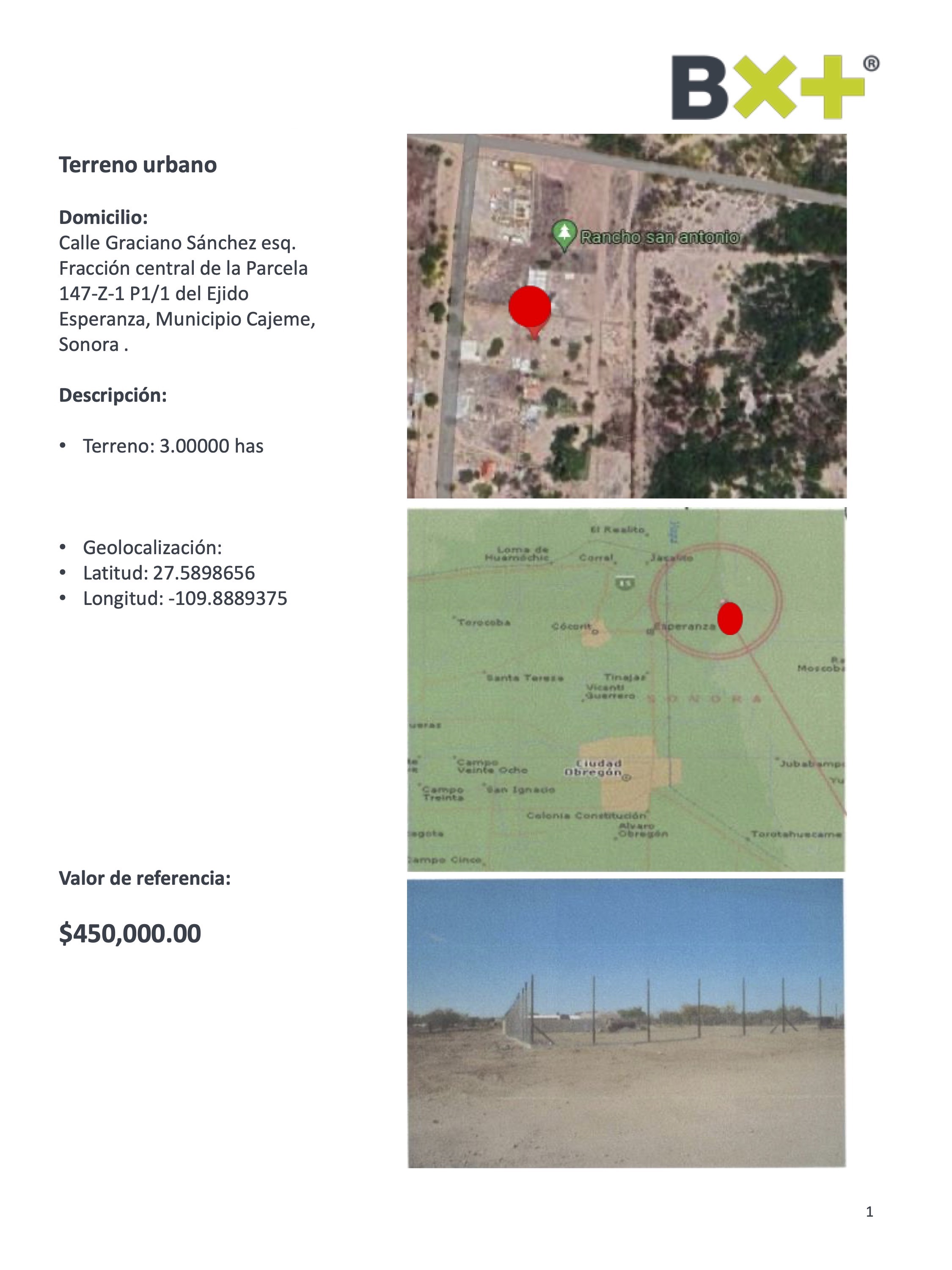 TERRENO URBANO, TERRENO: 3.00000 HAS, CALLE GRACIANO SÁNCHEZ ESQ. FRACCIÓN CENTRAL DE LA PARCELA 147-Z-1 P1/1 DEL EJIDO ESPERANZA, MUNICIPIO CAJEME, SONORA .