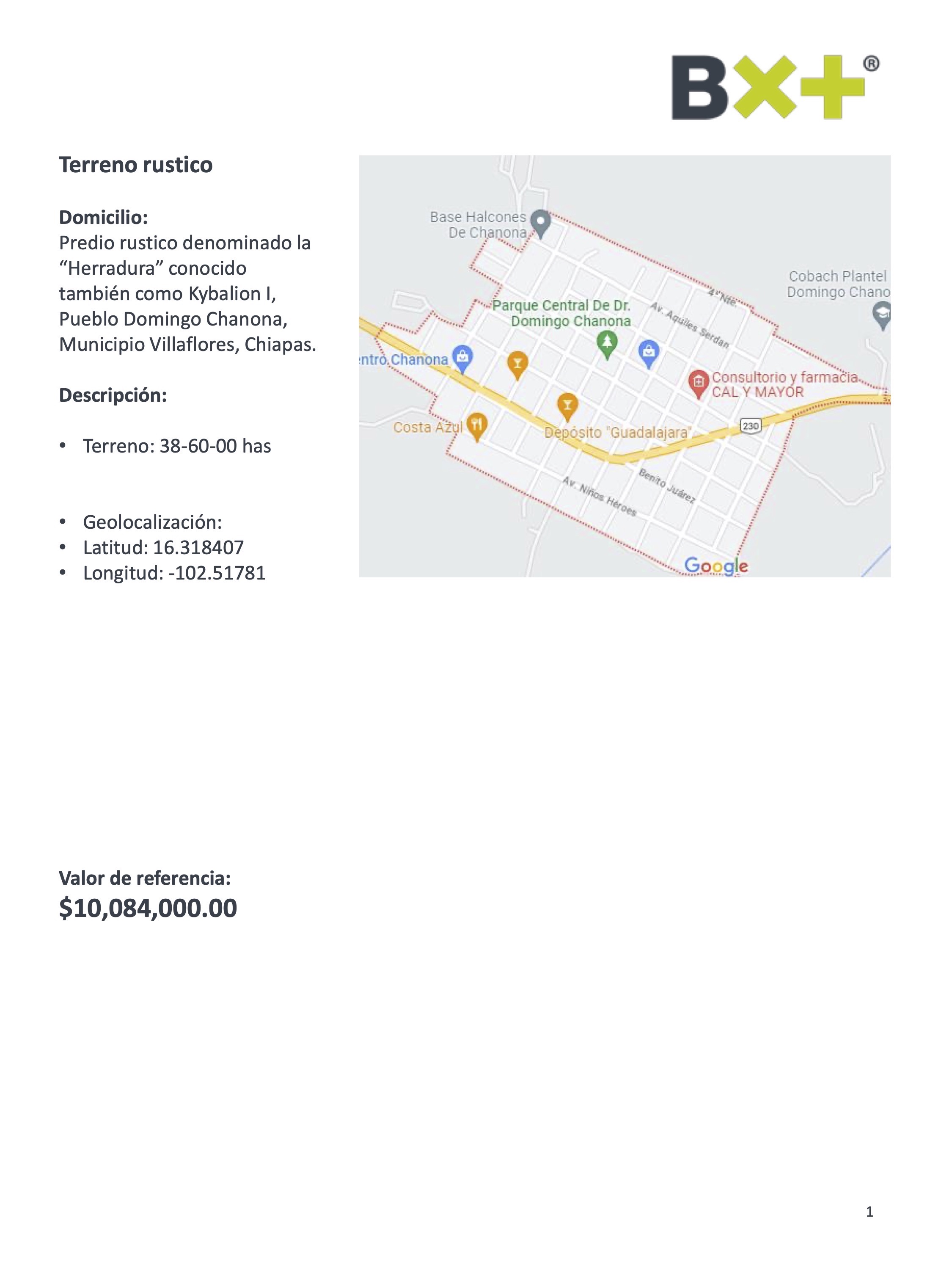 TERRENO RUSTICO, TERRENO: 38-60-00 HAS, PREDIO RUSTICO DENOMINADO LA “HERRADURA” CONOCIDO TAMBIÉN COMO KYBALION I, PUEBLO DOMINGO CHANONA, MUNICIPIO VILLAFLORES, CHIAPAS.