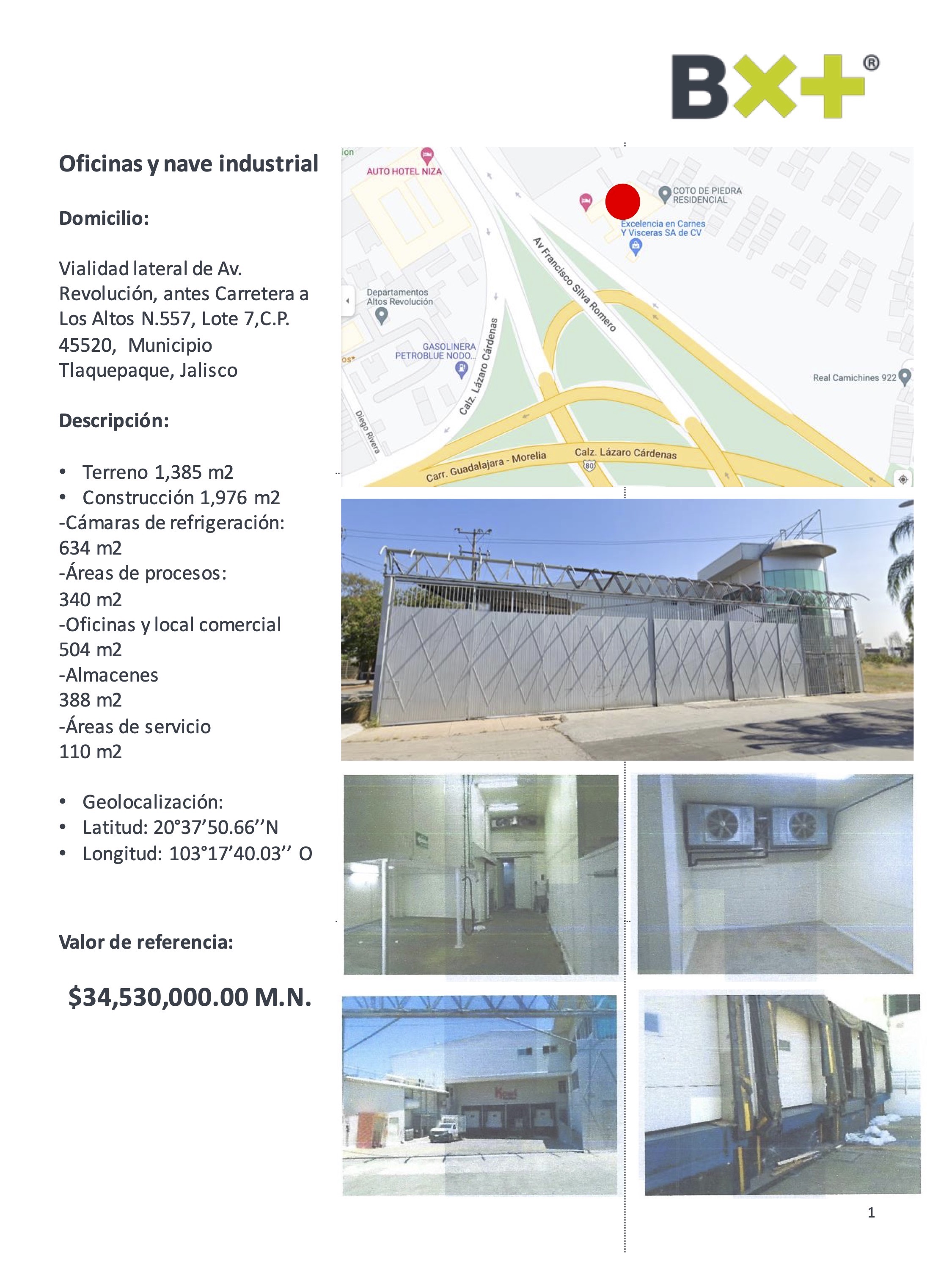 OFICINAS Y NAVE INDUSTRIA, TERRENO 1,385 M2, CONSTRUCCIÓN 1,976 M2, -CÁMARAS DE REFRIGERACIÓN: 634 M2, ÁREAS DE PROCESOS: 340 M2, OFICINAS Y LOCAL COMERCIAL 504 M2, ALMACENES 388 M2, ÁREAS DE SERVICIO 110 M2, VIALIDAD LATERAL DE AV. REVOLUCIÓN, ANTES CARRETERA A LOS ALTOS N.557, LOTE 7,C.P. 45520, MUNICIPIO TLAQUEPAQUE, JALISCO