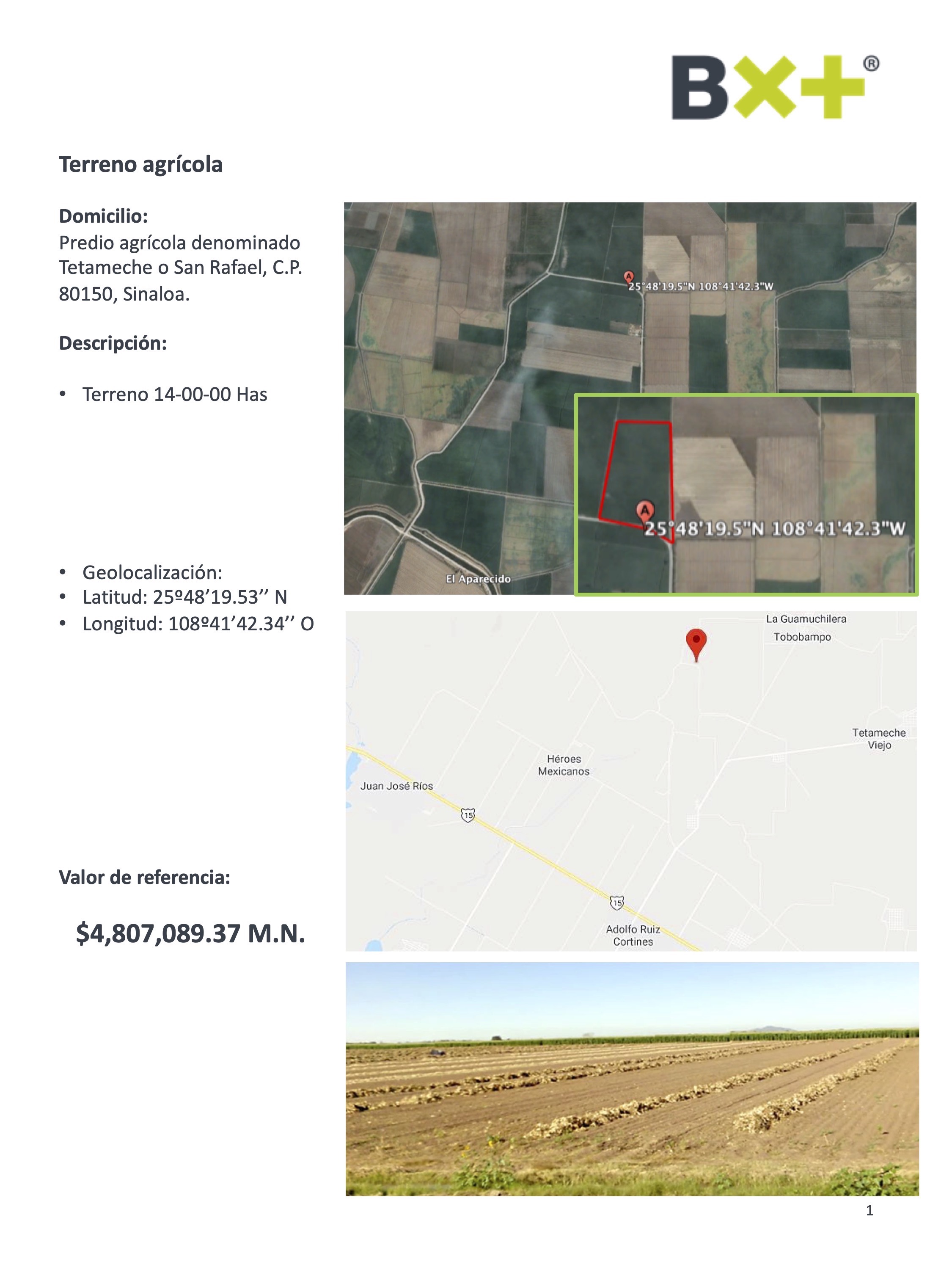 TERRENO AGRI´COLA, TERRENO 14-00-00 HAS, PREDIO AGRÍCOLA DENOMINADO TETAMECHE O SAN RAFAEL, C.P. 80150, SINALOA.