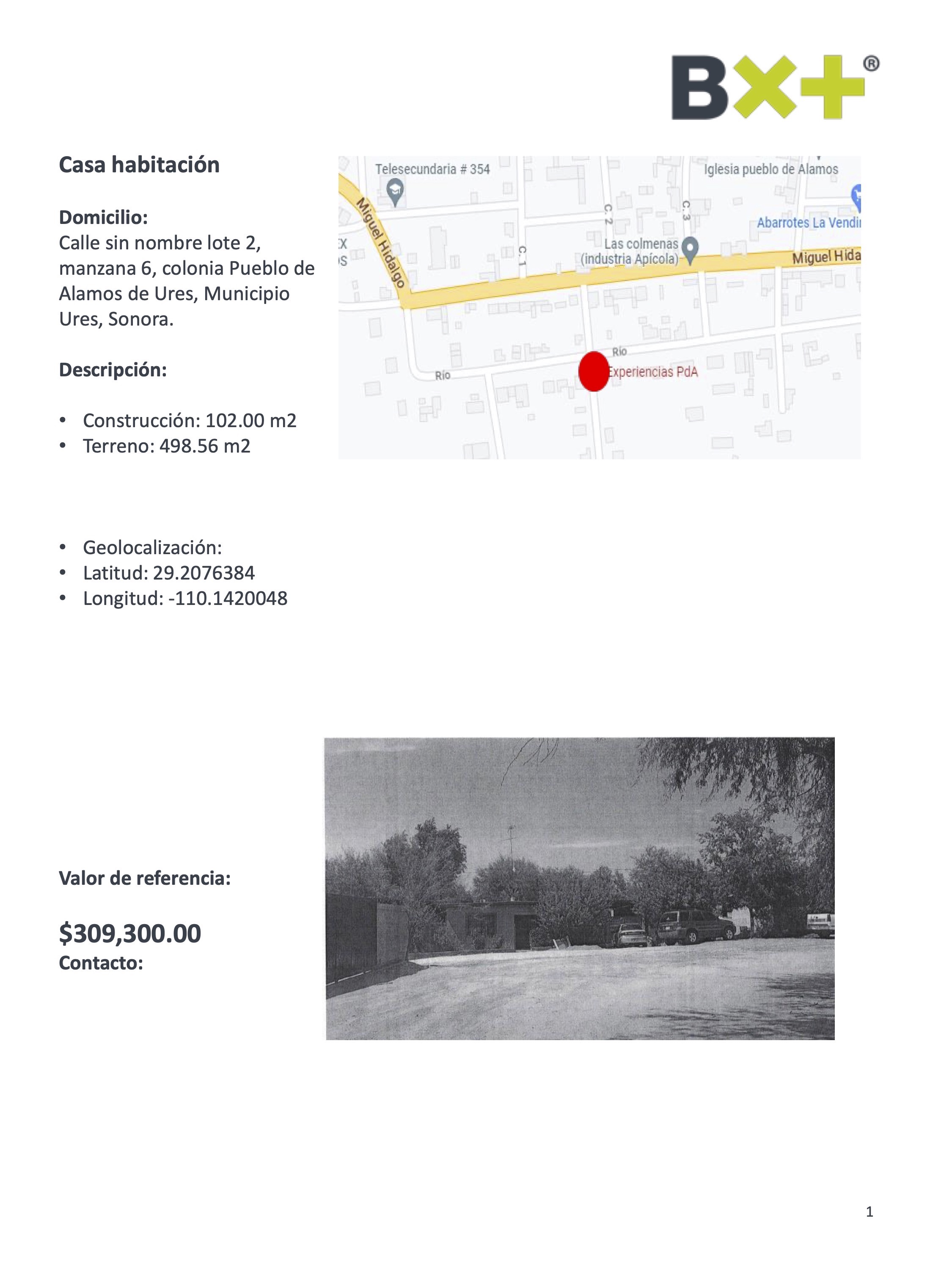 CASA HABITACIO´N, CONSTRUCCIÓN: 102.00 M2, TERRENO: 498.56 M2, CALLE SIN NOMBRE LOTE 2, MANZANA 6, COLONIA PUEBLO DE ALAMOS DE URES, MUNICIPIO URES, SONORA.