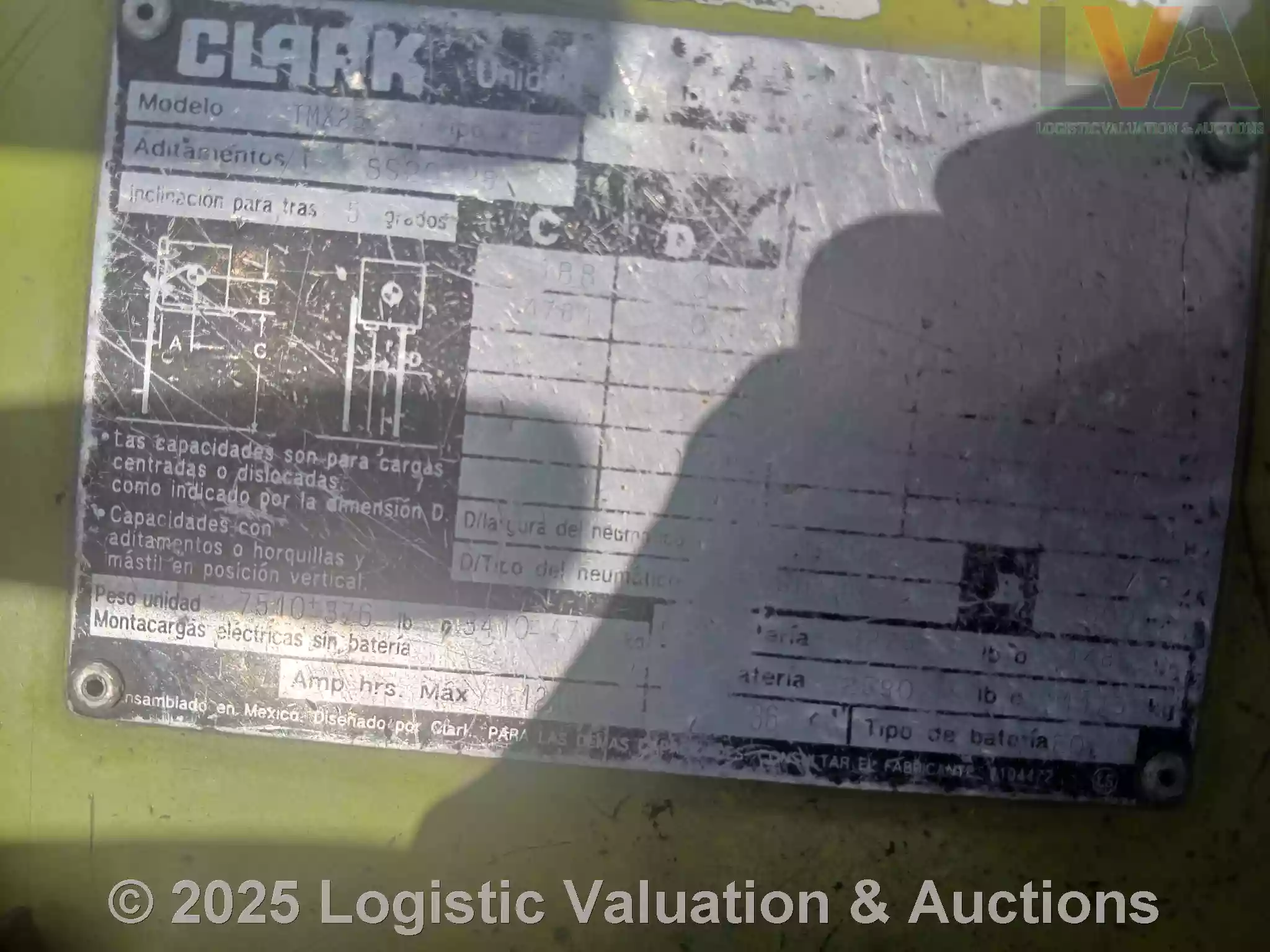 MONTACARGAS , MARCA: CLARK , MODELO:, AÑO: 2014, SERIE: TMX250-0309-9950MP, CONDICIONES: NO ENCIENDE POR BATERIA BAJA, COMETAN QUE ES OPERABLE
