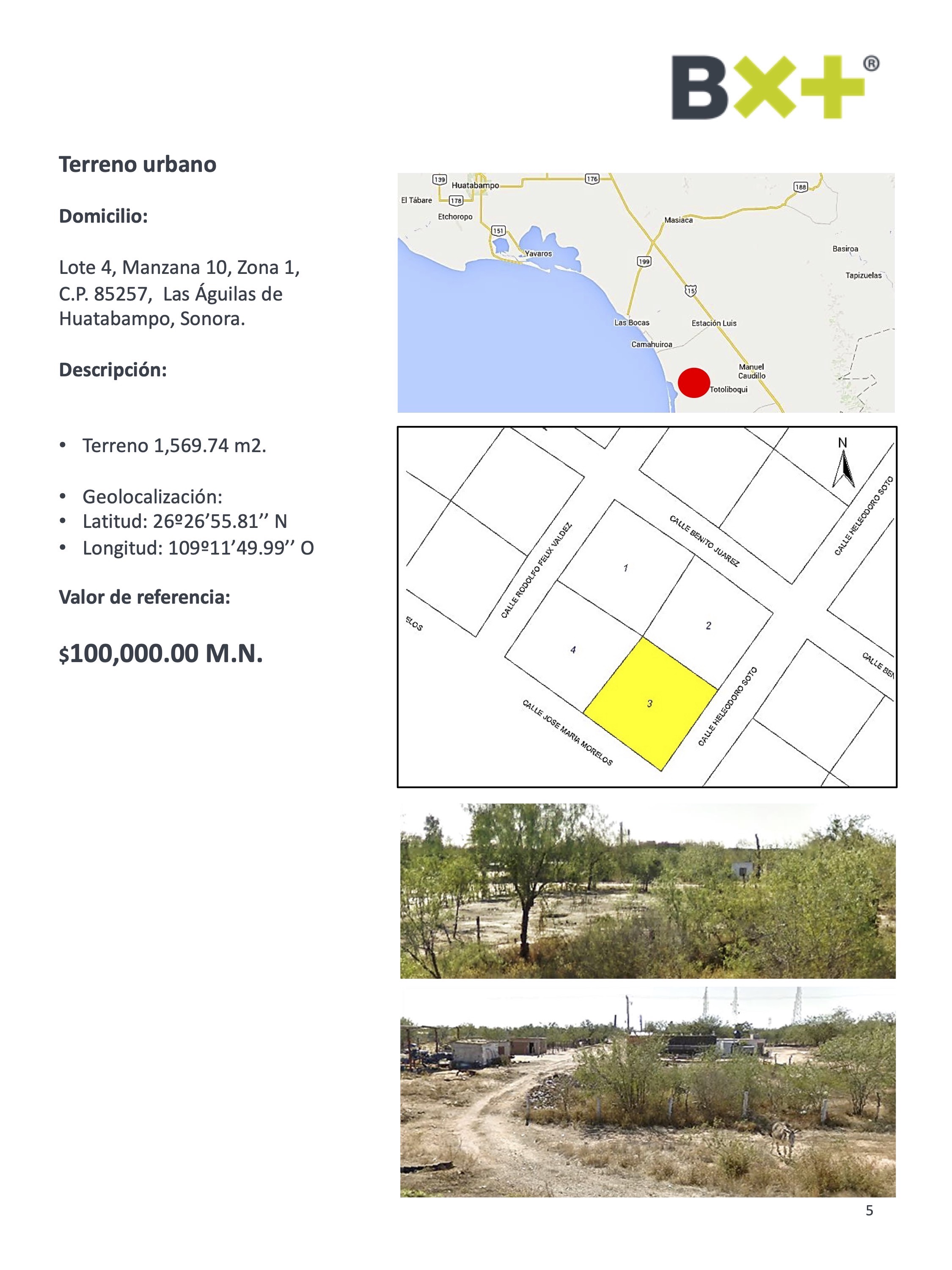 TERRENO URBANO, TERRENO 1,569.74 M2., LOTE 4, MANZANA 10, ZONA 1, C.P. 85257, LAS ÁGUILAS DE HUATABAMPO, SONORA.