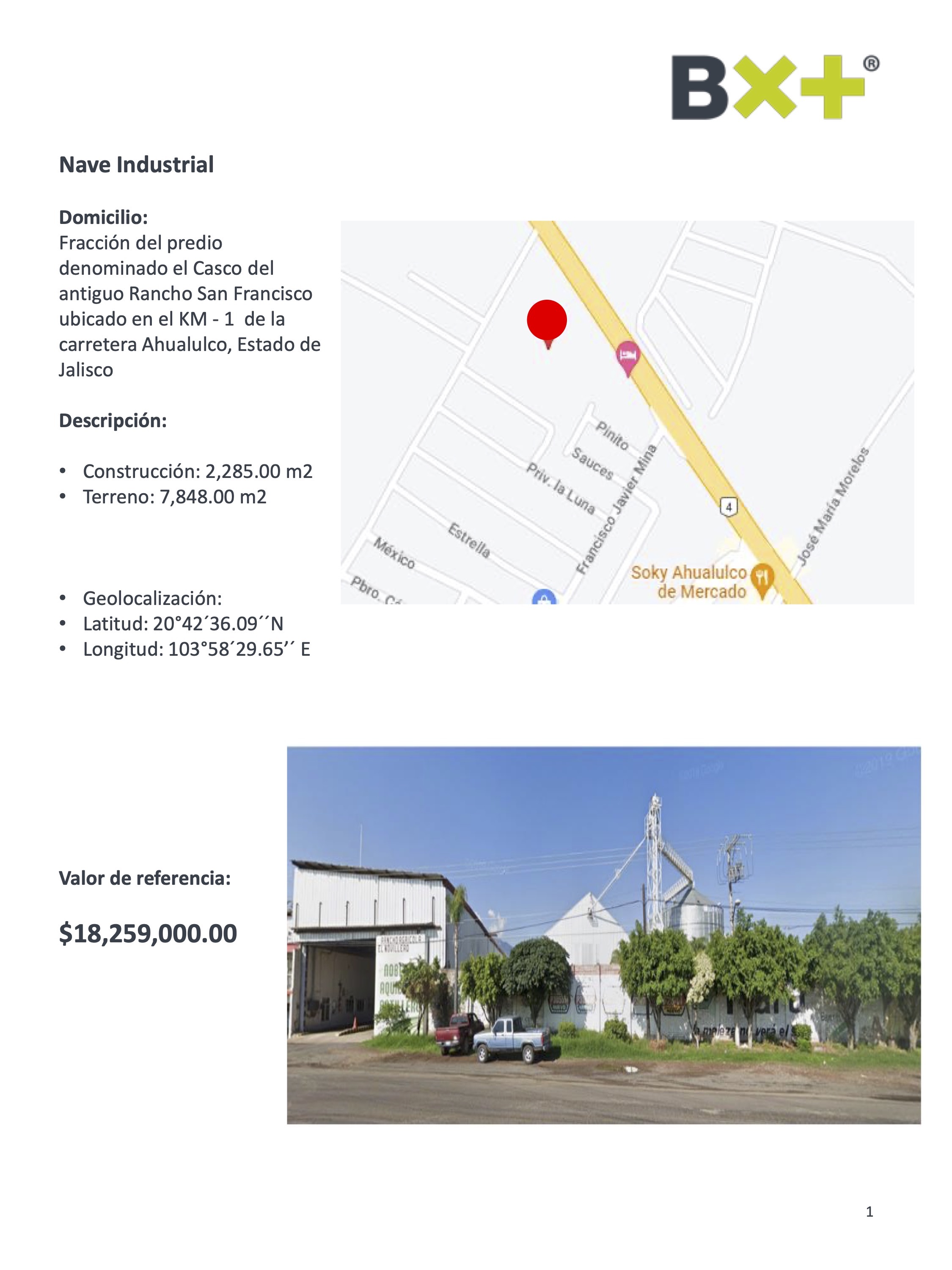 NAVE INDUSTRIAL, CONSTRUCCIÓN: 2,285.00 M2, TERRENO: 7,848.00 M2, FRACCIÓN DEL PREDIO DENOMINADO EL CASCO DEL ANTIGUO RANCHO SAN FRANCISCO UBICADO EN EL KM - 1 DE LA CARRETERA AHUALULCO, ESTADO DE JALISCO,