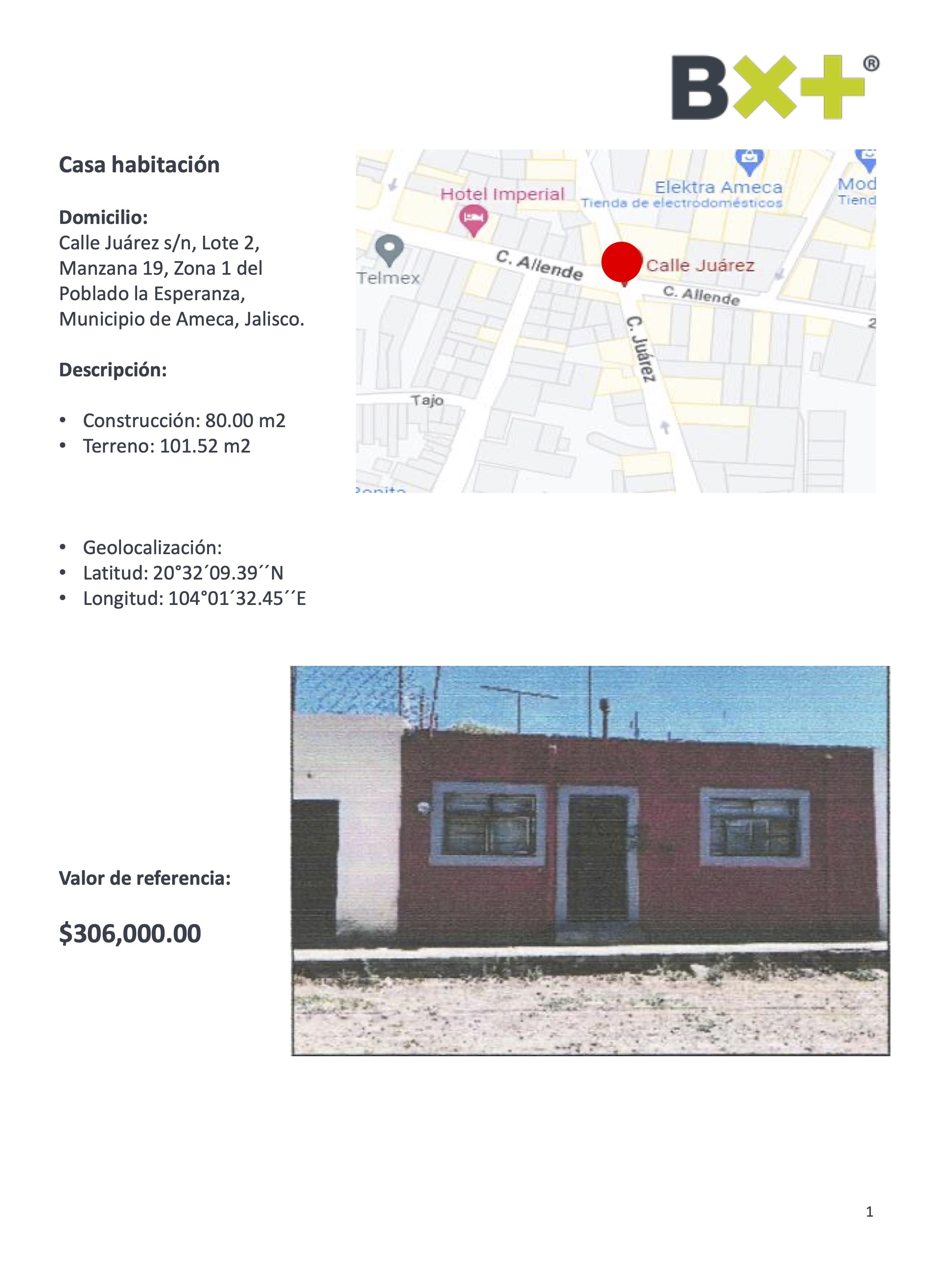 CASA HABITACIÓN, CONSTRUCCIÓN: 80.00 M2, TERRENO: 101.52 M2, CALLE JUÁREZ S/N, LOTE 2, MANZANA 19, ZONA 1 DEL POBLADO LA ESPERANZA, MUNICIPIO DE AMECA, JALISCO.