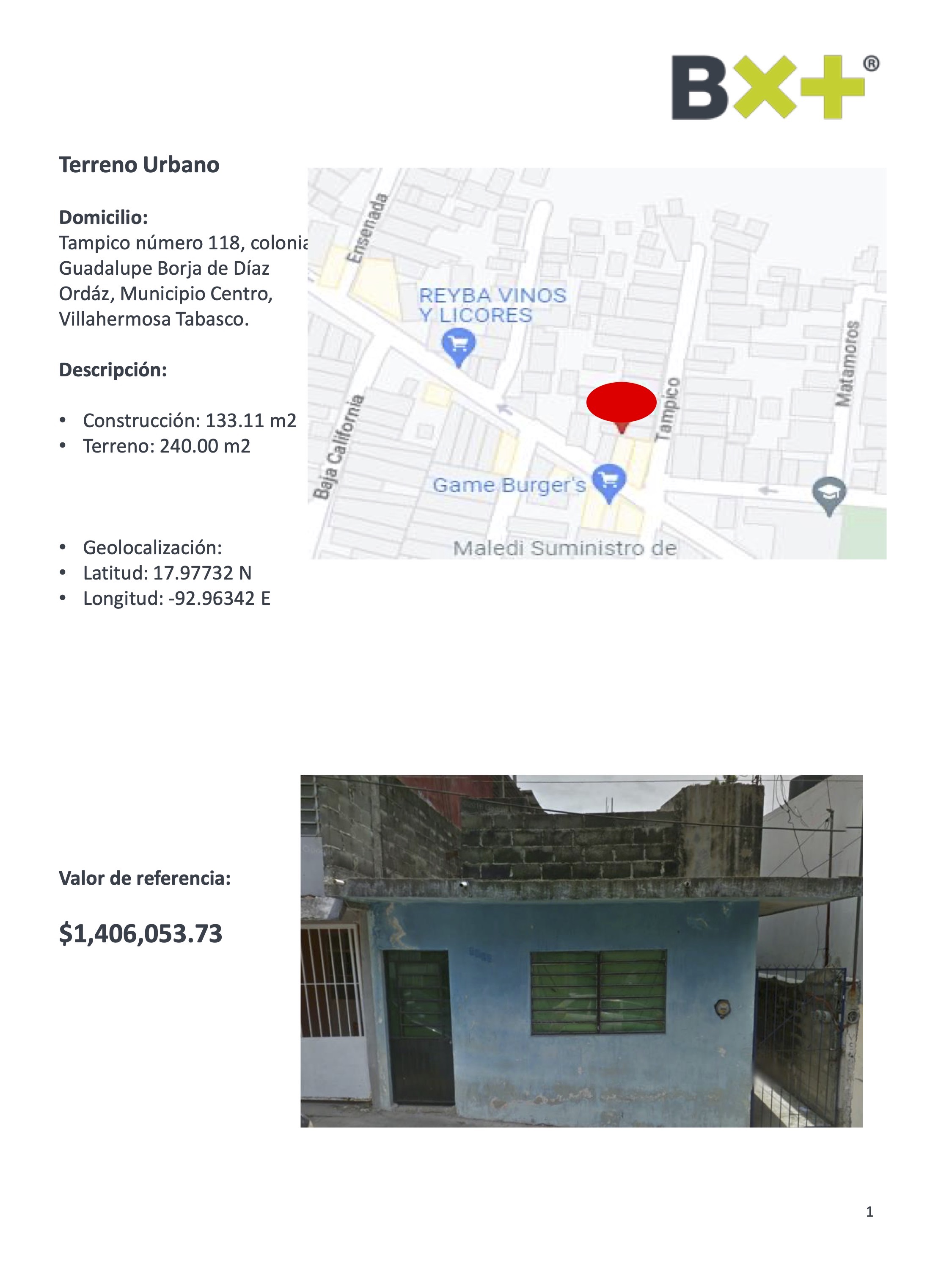 TERRENO URBANO, CONSTRUCCIÓN: 133.11 M2, TERRENO: 240.00 M2, TAMPICO NÚMERO 118, COLONIA GUADALUPE BORJA DE DÍAZ ORDÁZ, MUNICIPIO CENTRO, VILLAHERMOSA TABASCO.