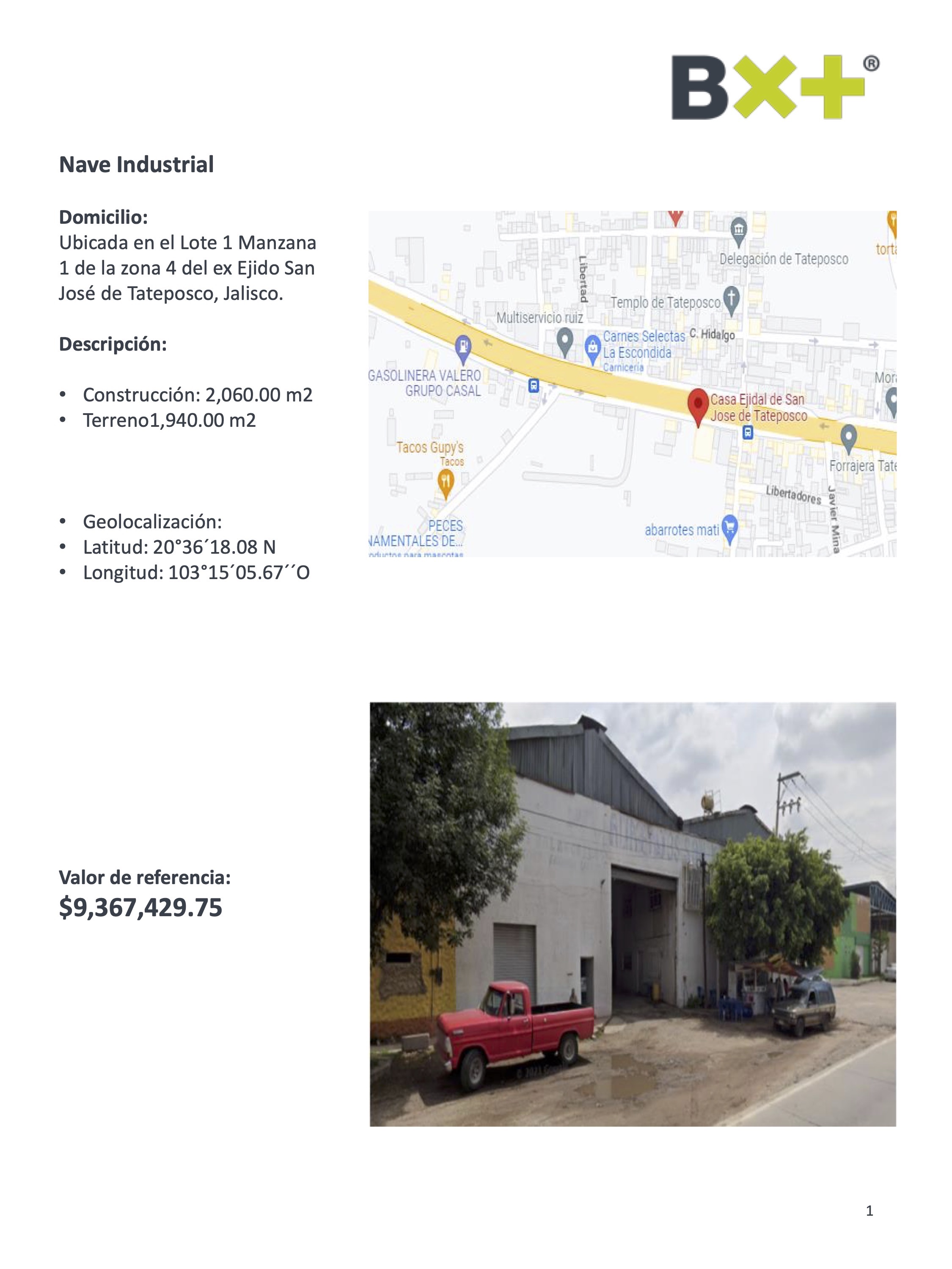 NAVE INDUSTRIAL, CONSTRUCCIÓN: 2,060.00 M2, TERRENO1,940.00 M2, UBICADA EN EL LOTE 1 MANZANA 1 DE LA ZONA 4 DEL EX EJIDO SAN JOSÉ DE TATEPOSCO, JALISCO.