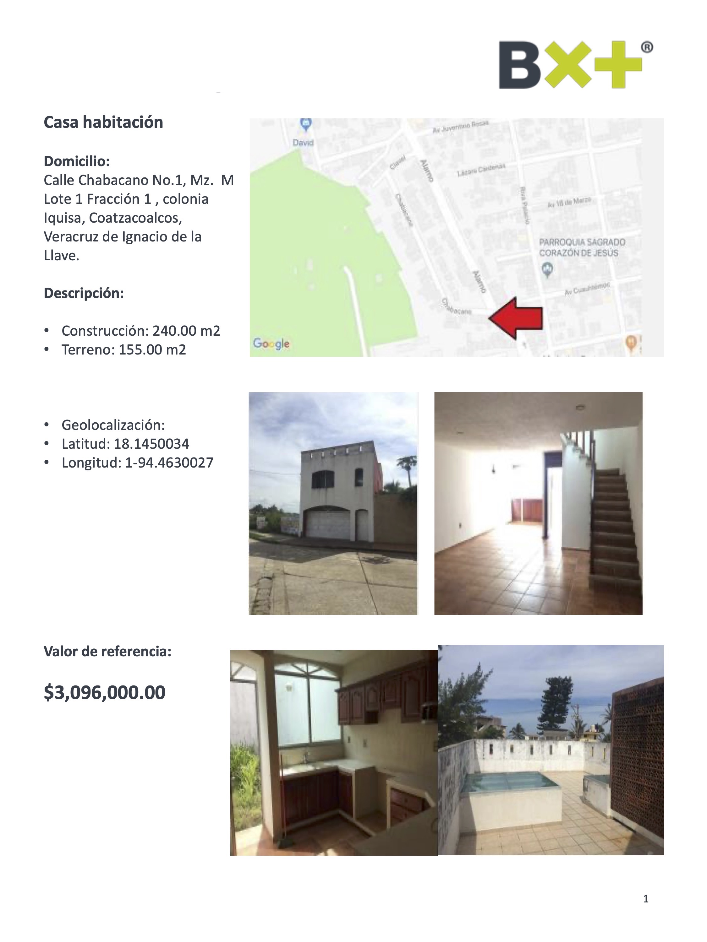 CASA HABITACIÓN, CONSTRUCCIÓN: 240.00 M2, TERRENO: 155.00 M2, CALLE CHABACANO NO.1, MZ. M LOTE 1 FRACCIÓN 1, COLONIA IQUISA, COATZACOALCOS, VERACRUZ DE IGNACIO DE LA LAVE.