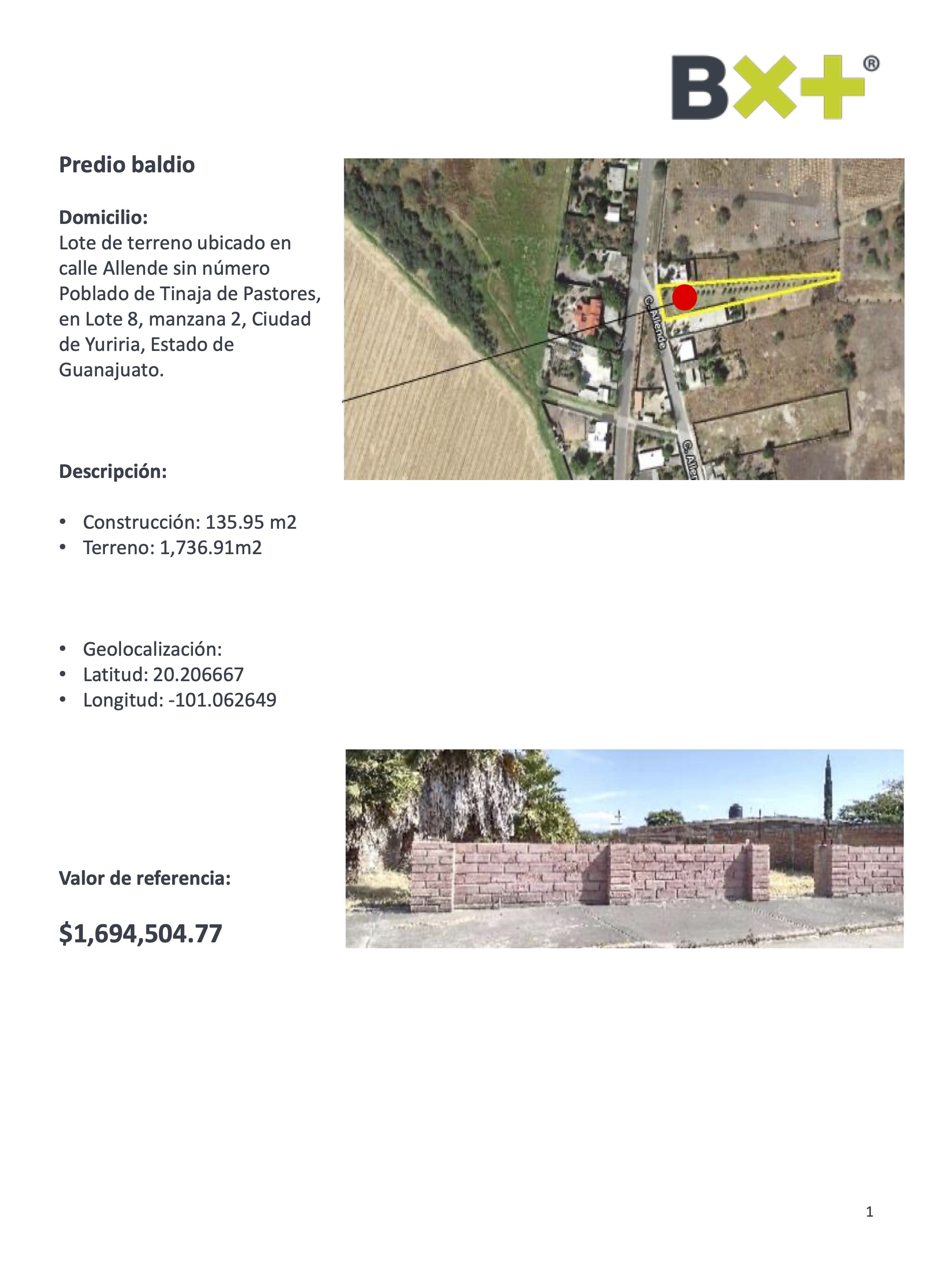 PREDIO BALDIO, CONSTRUCCIÓN: 135.95 M2, TERRENO: 1,736.91M2, LOTE DE TERRENO UBICADO EN CALLE ALLENDE SIN NÚMERO POBLADO DE TINAJA DE PASTORES, EN LOTE 8, MANZANA 2, CIUDAD DE YURIRIA, ESTADO DE GUANAJUATO.